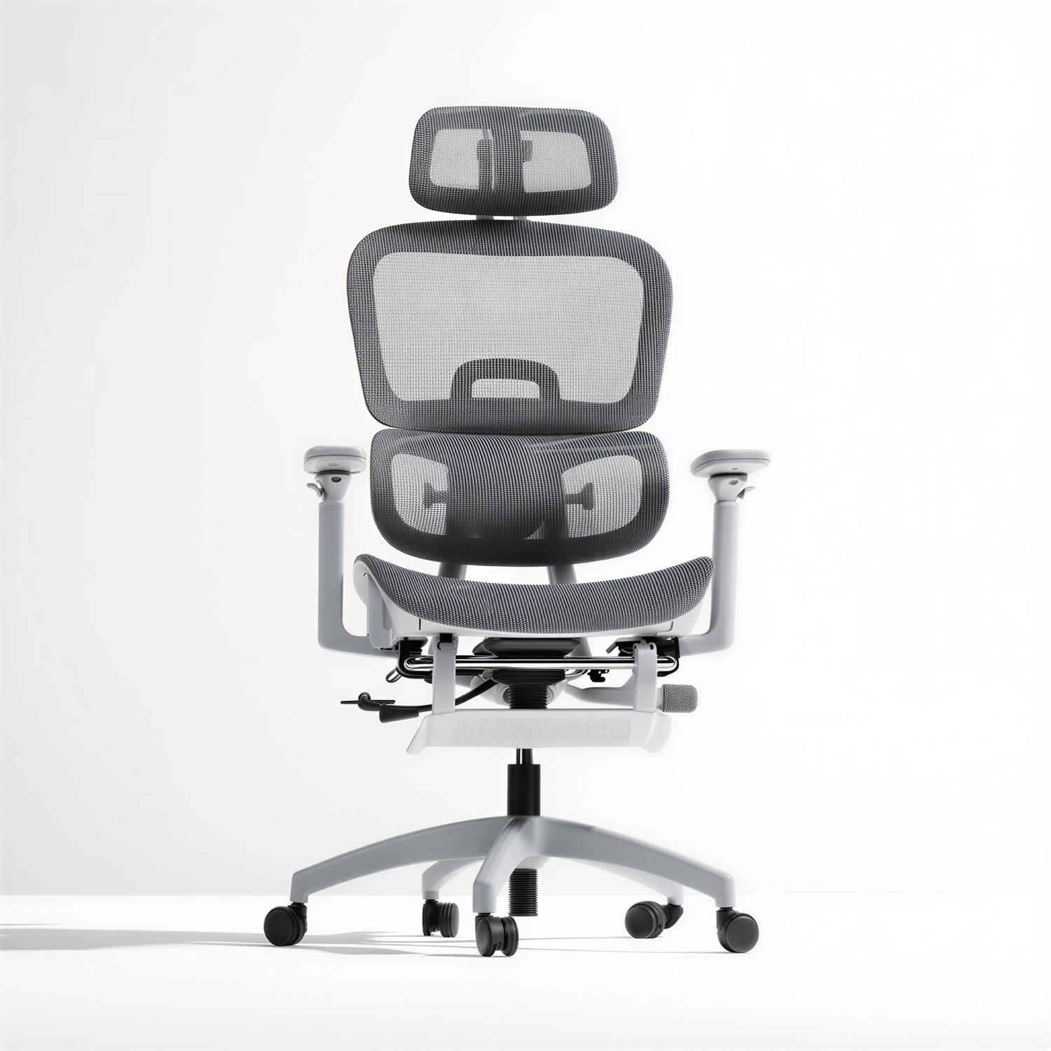 Dieser Bürostuhl ist für den täglichen Einsatz im Arbeitsumfeld vorgesehen und verfügt über verschiedene manuelle Einstellmöglichkeiten, darunter eine höhenverstellbare Sitzfläche, eine verstellbare Sitztiefe, eine neigbare Rückenlehne mit einem maximalen Neigungswinkel von bis zu 135°, eine separat einstellbare Kopfstütze sowie verstellbare Armlehnen; zusätzlich ist eine ausziehbare Fußstütze integriert, der Stuhl ist drehbar, mit Rollen ausgestattet und besteht aus einem Netzmaterial, das für den regelmäßigen Gebrauch ausgelegt ist, die Abmessungen betragen aufrecht 66 × 64 × 114–122 cm und geneigt 66 × 89 × 100–108 cm, die Sitzhöhe liegt zwischen 49 und 57 cm, die maximale Belastung beträgt 120 kg, Montage erforderlich.