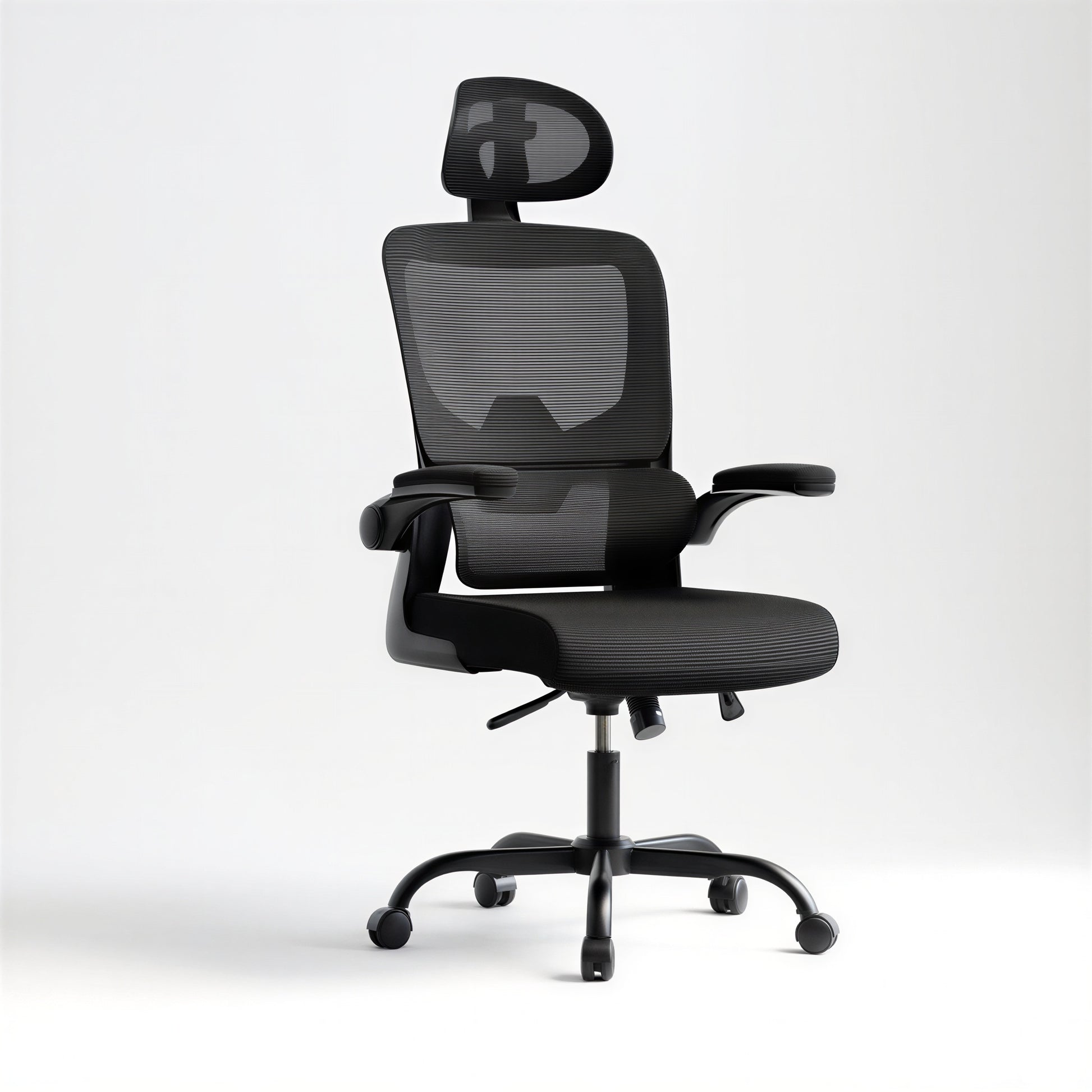 Dieser Bürostuhl ist für den Einsatz im Büro oder Homeoffice vorgesehen und verfügt über eine Sitz- und Rückenfläche aus Netzmaterial sowie eine gepolsterte Sitzfläche aus Schaumstoff; die Sitzhöhe ist verstellbar, ebenso die Höhe der Rückenlehne und der Kopfstütze, zusätzlich sind klappbare Armlehnen integriert, die bei Bedarf hochgeklappt werden können, der Stuhl bietet eine Schwingfunktion mit einem Neigungsbereich von etwa 90° bis 105° mit manuell einstellbarer Neigungsspannung, ist drehbar und mit Rollen ausgestattet, die ungefähren Produktabmessungen betragen 51 × 54 × 110 cm, die Gesamthöhe ist zwischen ca. 110 und 127 cm einstellbar, das Produkt besteht aus Metall, Kunststoff und Nylon, das Artikelgewicht liegt bei etwa 14,3 kg, die maximale Belastbarkeit beträgt bis zu 136 kg, Montage erforderlich.