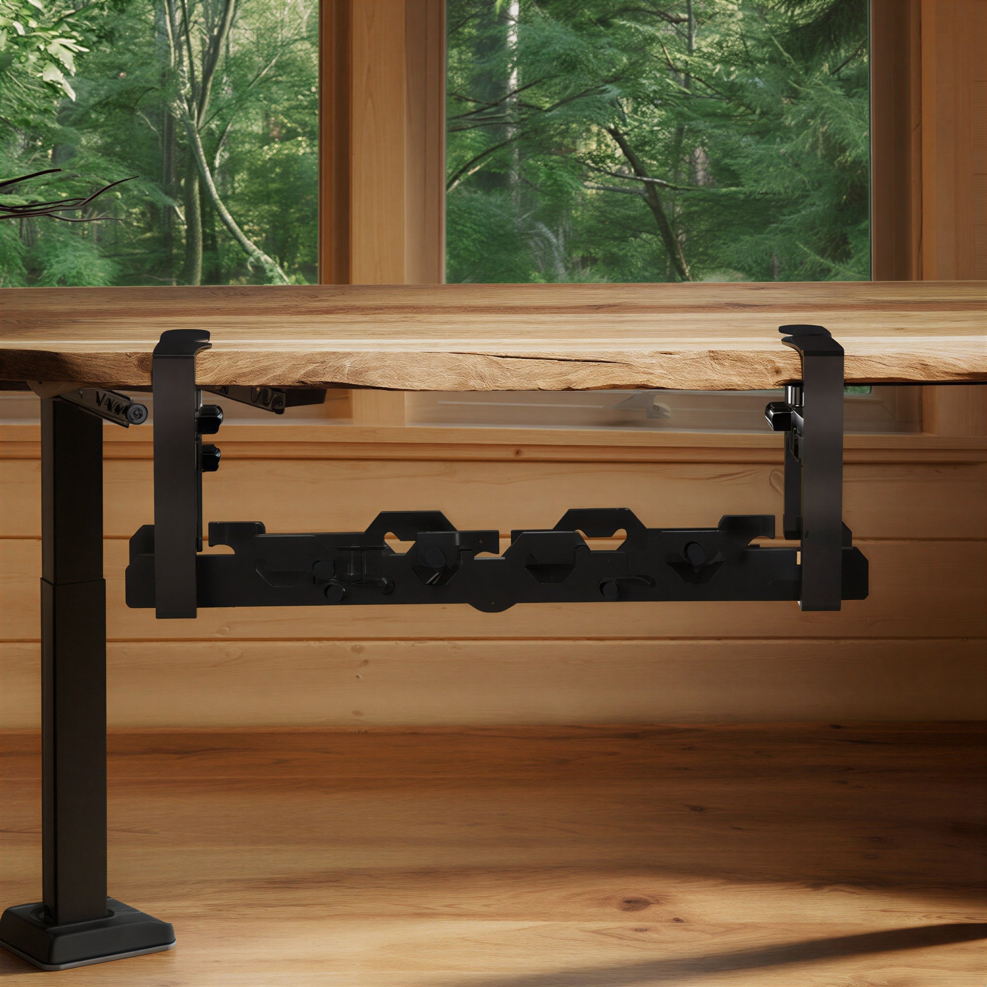 Dieses Kabelmanagement-System für den Schreibtisch dient zur Organisation von Kabeln, Mehrfachsteckdosen und Zubehör unter der Tischplatte. Es besteht aus Metall mit Schutzbeschichtung und ist für den täglichen Gebrauch vorgesehen. Das offene Design unterstützt die Luftzirkulation und die Wärmeableitung und ermöglicht gleichzeitig eine einfache Kabelführung. Die Montage erfolgt ohne Bohren mittels verstellbarer Klemmschrauben und ist für unterschiedliche Tischplattenstärken geeignet. Seitliche Begrenzungen helfen, das Verrutschen von Kabeln und Geräten zu reduzieren. Das Kabelmanagement eignet sich für klassische Schreibtische sowie für höhenverstellbare Schreibtische und trägt zu einer übersichtlichen Arbeitsumgebung im Büro oder Homeoffice bei.